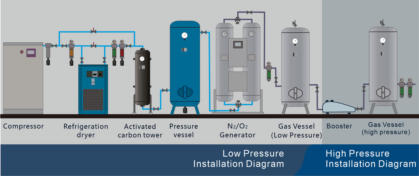 The whole system is composed of the air compressor, the compressed air purification system, multiple precision filters, and the PSA oxygen generator system. The pressure of qualified oxygen is between 0.1 and 0.6 MPa. If high pressure is required, an oxygen booster can be selected additionally, and the pressure of qualified oxygen can be as high as 20 MPa or even higher. It can be directly used for filling high-pressure gas cylinders.